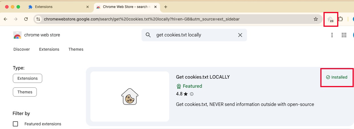 Go to Chrome Web Store and download the extension get cookies.txt locally.